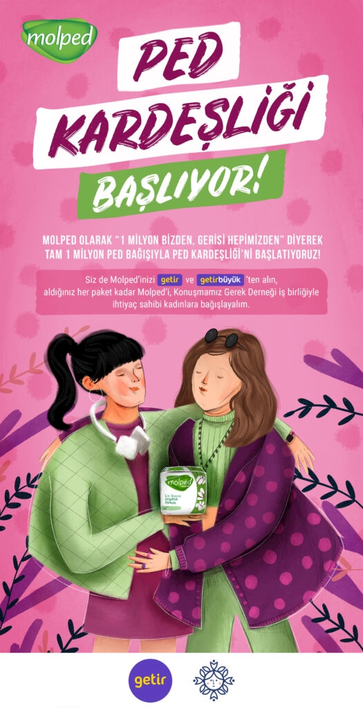 Hijyenik pede her kadının erişemediği gerçeğinden hareketle Molped, ‘Ped Kardeşliği’ ile herkesi pede erişimde zorluk çeken kadınlara destek olmaya davet ediyor. Getir iş birliği ile hayata geçirilen projede, Konuşmamız Gerek Derneği aracılığıyla Türkiye’nin dört bir yanındaki binlerce kadına ihtiyacı olan ped desteği sağlanması amaçlanıyor. Ped Kardeşliği’ni, 1 milyon ped gönderimi yaparak başlatan Molped, Getir ile “1 Molped siparişi, 1 Molped desteği” diyerek projeyi daha da büyütüyor.